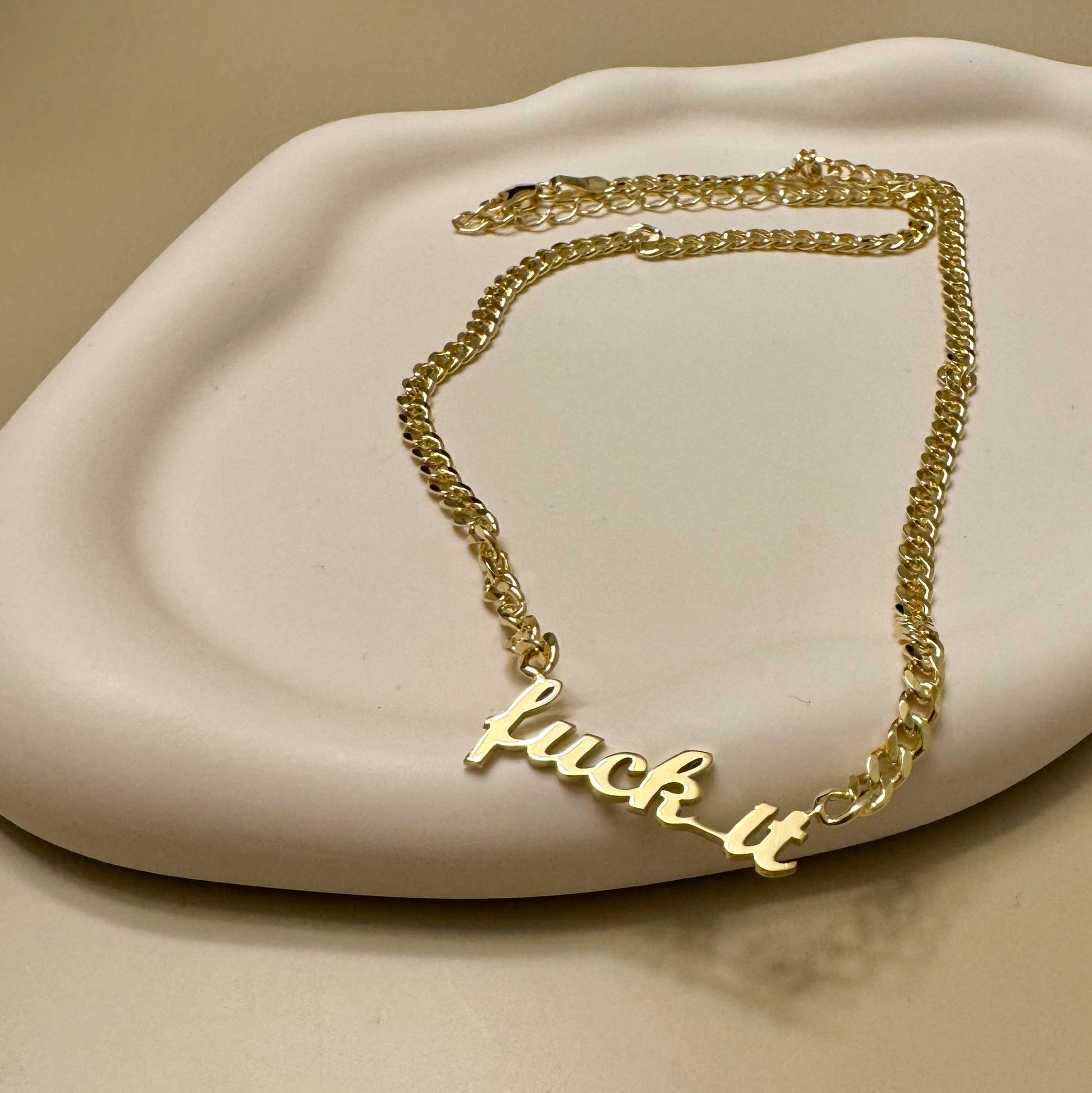 Show your love of a favorite romance microtrope with our new f*ck it cuban chain script necklace. Made from hypoallergenic materials, sterling silver, plated with 14k gold.