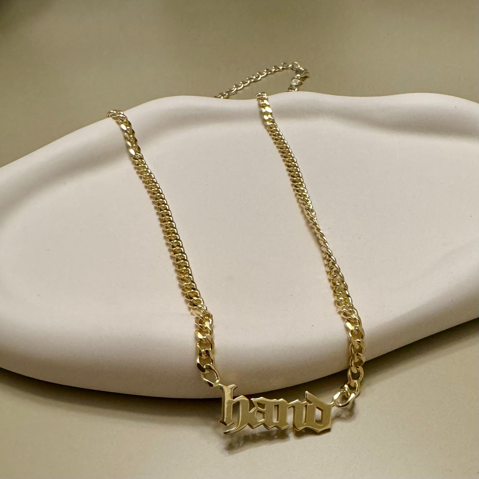 Featuring our favorite smutty microtrope, the hand necklace sits on thick plated curb chain. Made from hypoallergenic materials, sterling silver, plated with 14k gold.