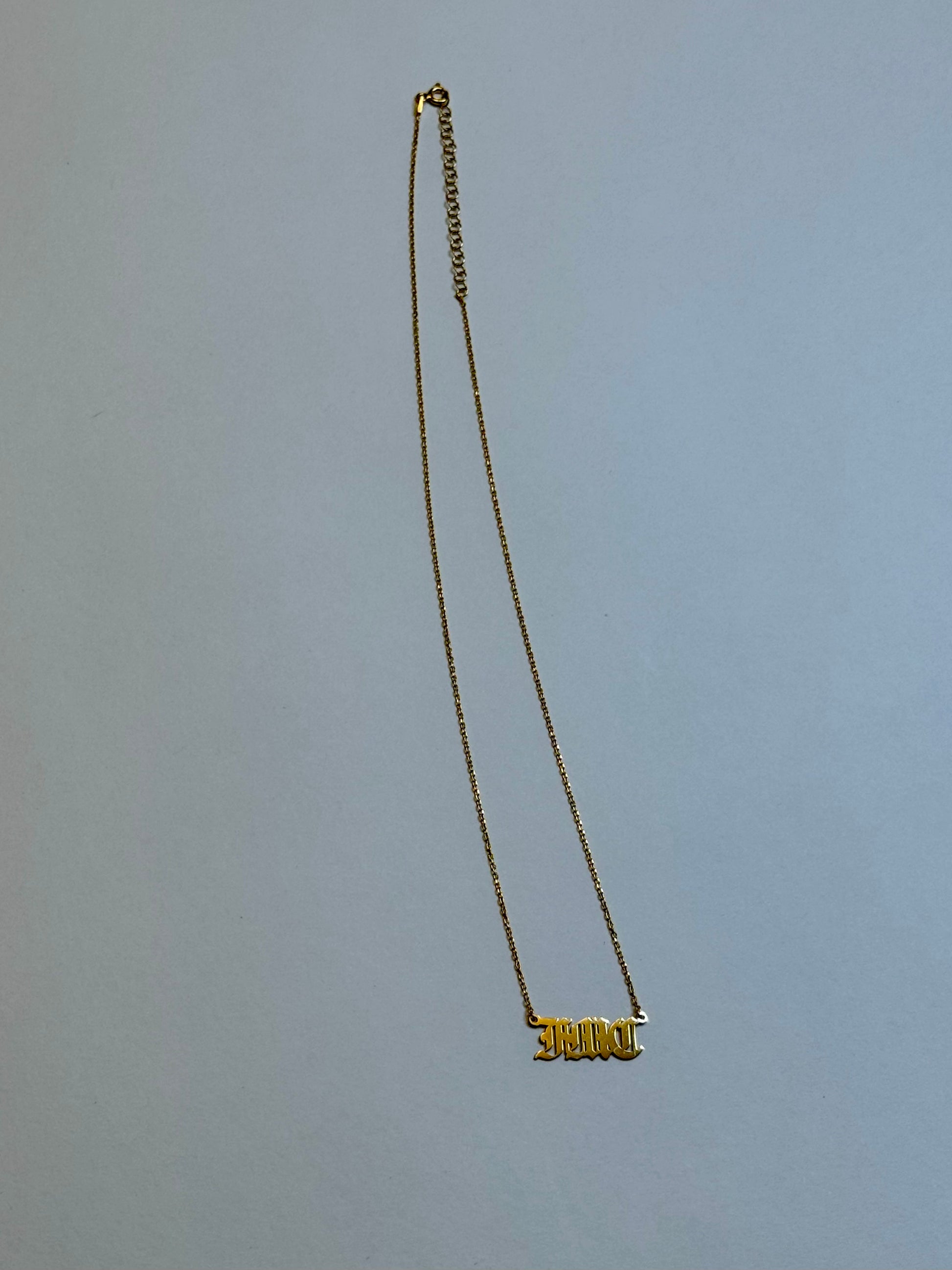 Our favorite new necklace! This hypoallergenic stunner features old english font for the perfect edgy touch to an outfit. is sterling silver, plated with 18k gold.