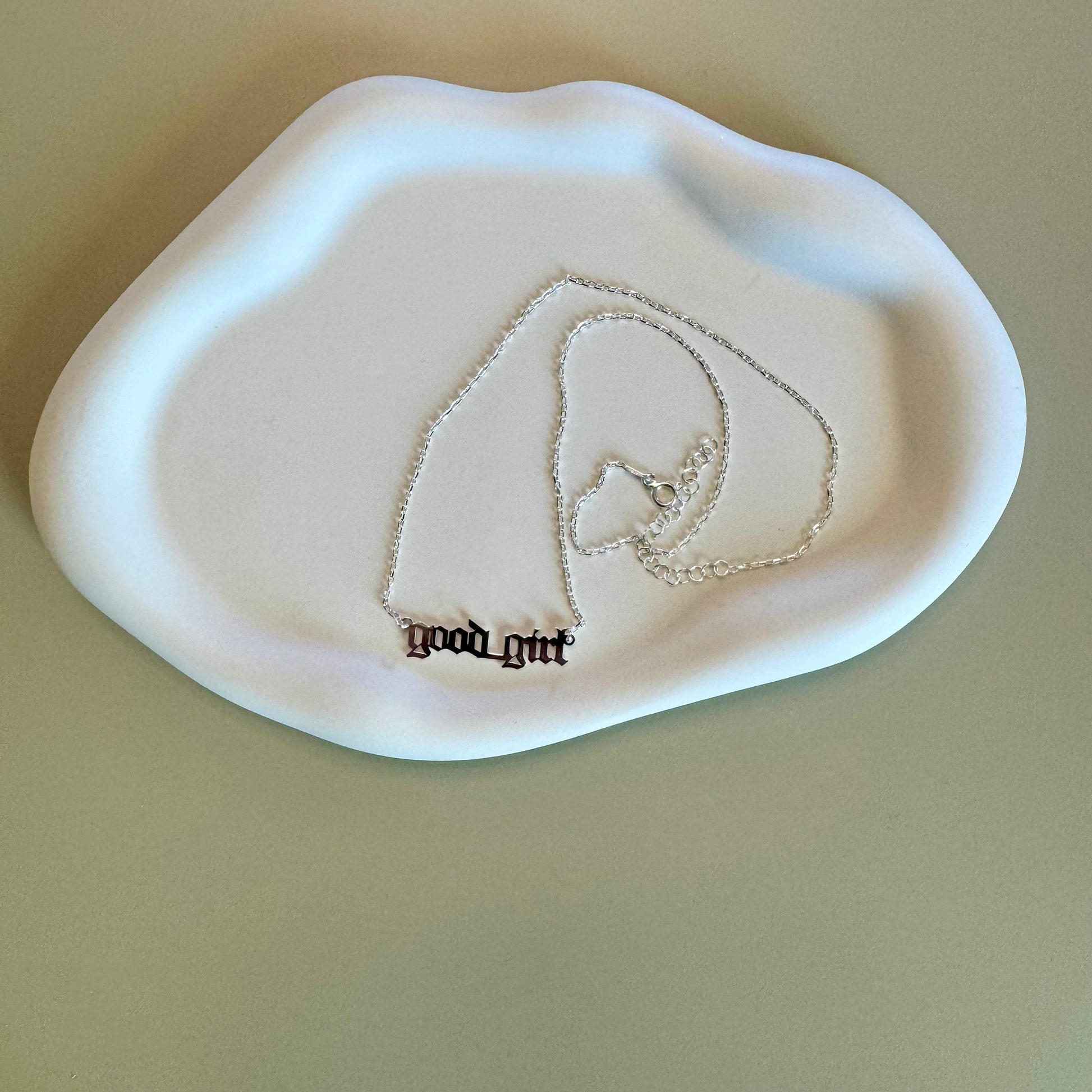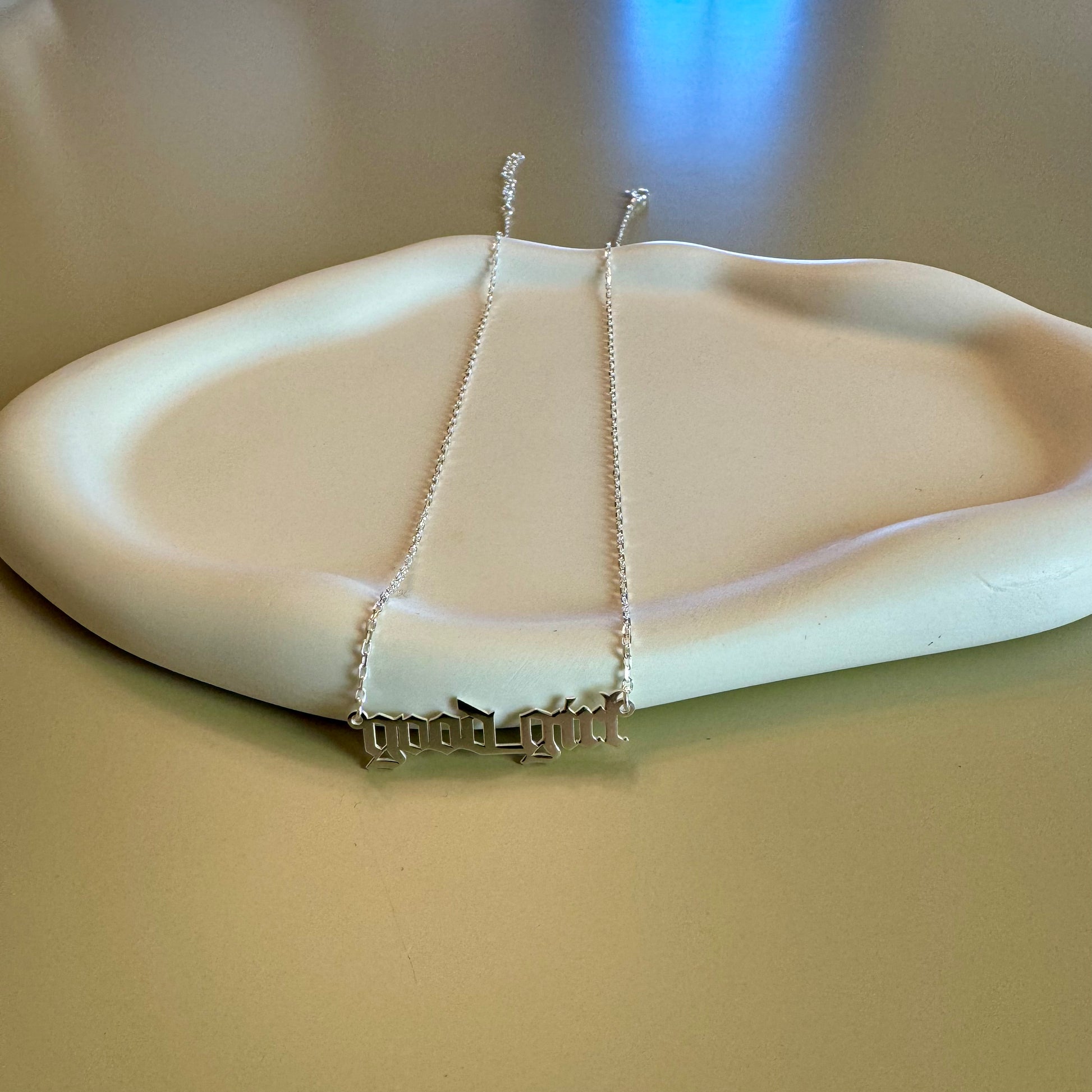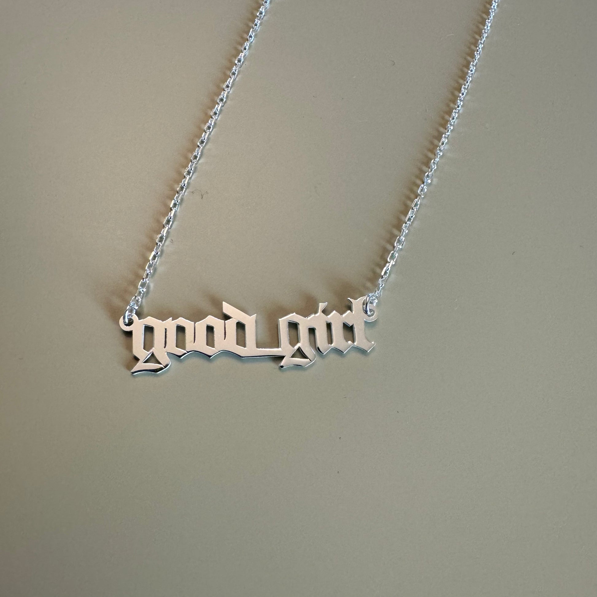 We refuse to take off this necklace! The good girl necklace features old english font for the perfect edgy touch to an outfit. Made from hypoallergenic materials, sterling silver, gold option plated with 14k gold.
