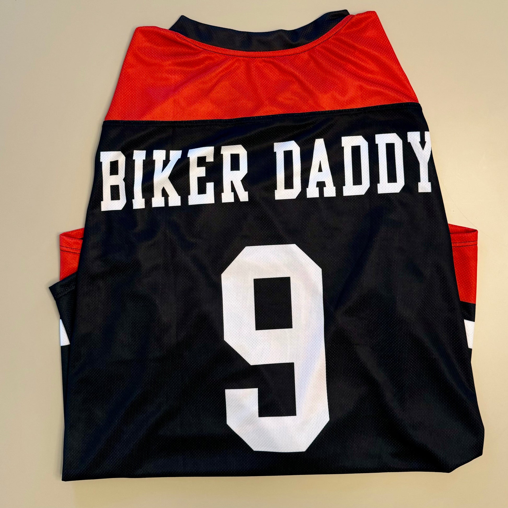 Rep your love of Biker Boys and hockey romance with this special edition Kristen Granata hockey jersey. Inspired by the biker boy that keeps us laughing on BikeTok with Kristen and helped map our favorite spicy scenes in Puck Pact. Featuring a hand-illustrated sport bike in on jersey front and #9 BIKER DADDY, black, red, and white.