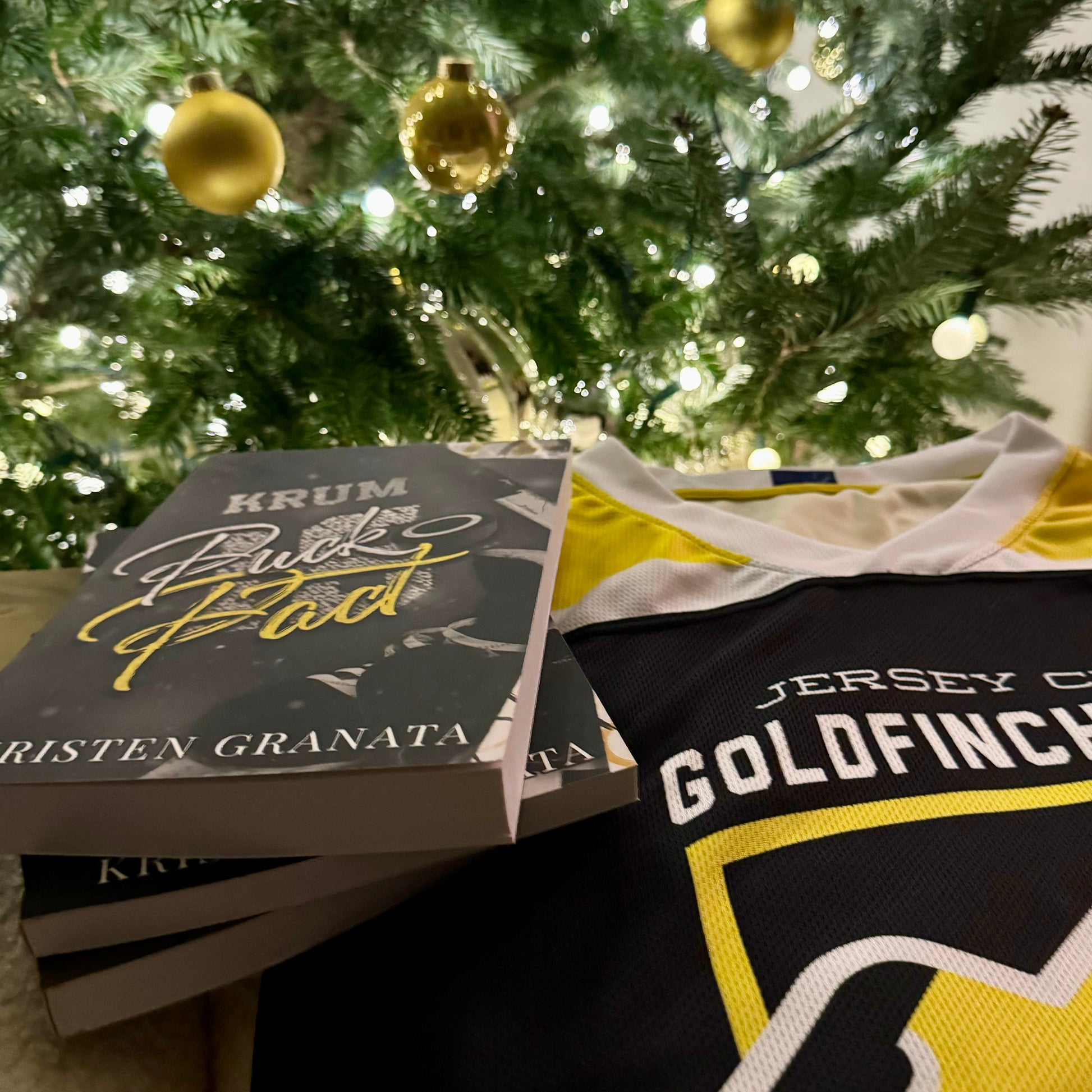 Rep your love of hockey romance and the Jersey City Goldfinches with this special edition Kristen Granata hockey jersey. Inspired by Krum Cake, the bike-riding, hockey-playing, sexy single dad from Puck Pact. Featuring a hand-illustrated Goldfinches logo on jersey front and #16 BIKER DADDY, black, yellow, and white.